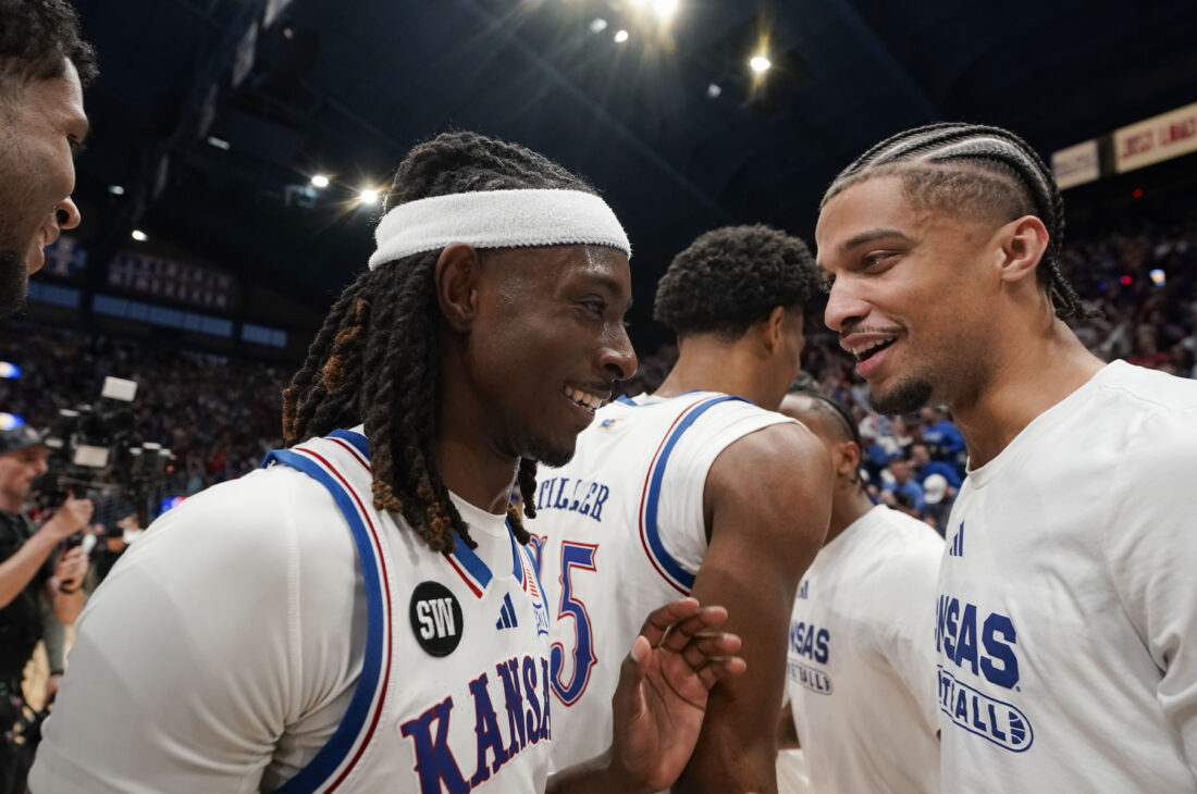 Kansas guard Jamari McDowell, left and Kansas guard Justin Cross (25) celebrate the Jayhawks’ 90-82 win over BYU on Saturday, Jan. 31, 2026 at Allen Fieldhouse. Photo by Nick Krug