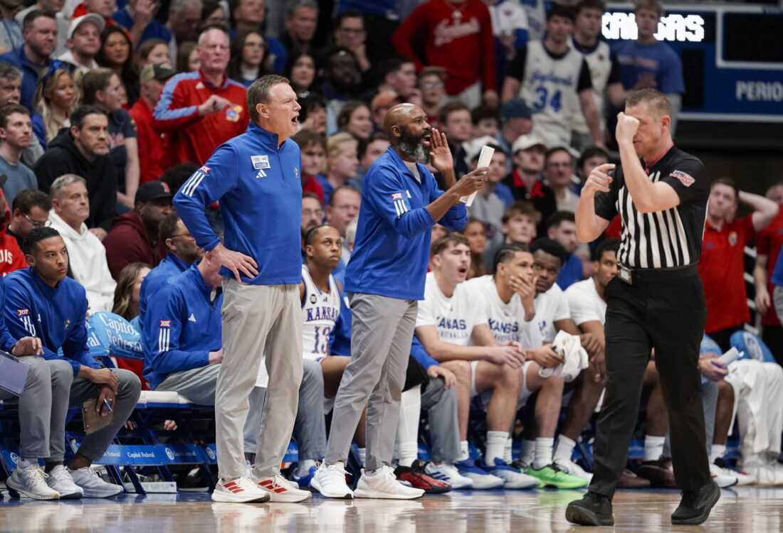 Kansas head coach Bill Self and assistant coach Jacque Vaughn get the attention of the players during the first half on Saturday, Jan. 31, 2026 at Allen Fieldhouse. Photo by Nick Krug