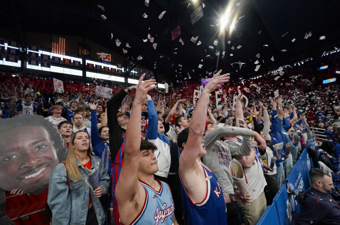 Confetti explodes from the Kansas student section prior to tipoff against BYU on Saturday, Jan. 31, 2026 at Allen Fieldhouse. Photo by Nick Krug