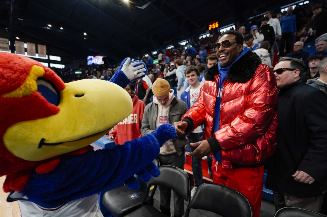 Kansas legend Paul Pierce is greeted by Baby Jay prior to tipoff against BYU on Saturday, Jan. 31, 2026 at Allen Fieldhouse. Photo by Nick Krug