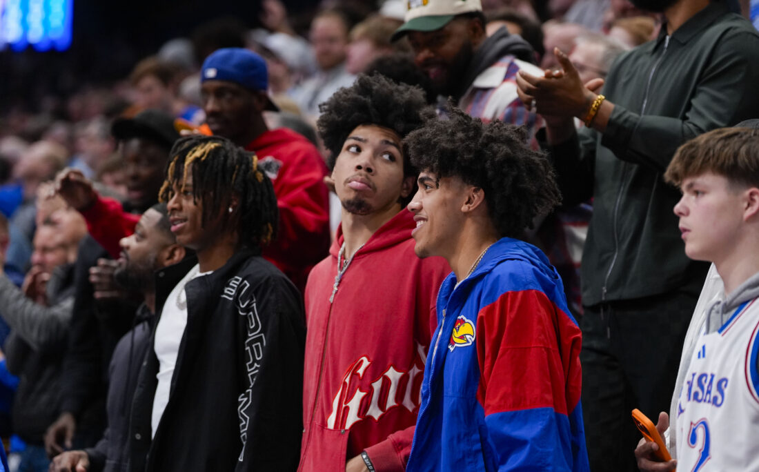 Kansas recruit Tyran Stokes, center, stands behind the Kansas bench during the second half on Saturday, Jan. 31, 2026 at Allen Fieldhouse. Photo by Nick Krug
