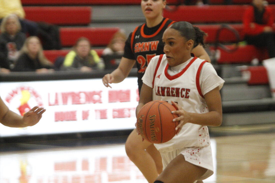 Lawrence senior Jada Baars-Turner dribbles the ball in a first round substate game against Shawnee Mission Northwest on Tuesday, March 3, 2026, in Lawrence.