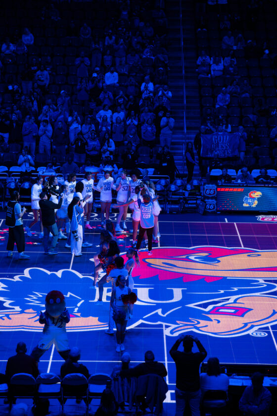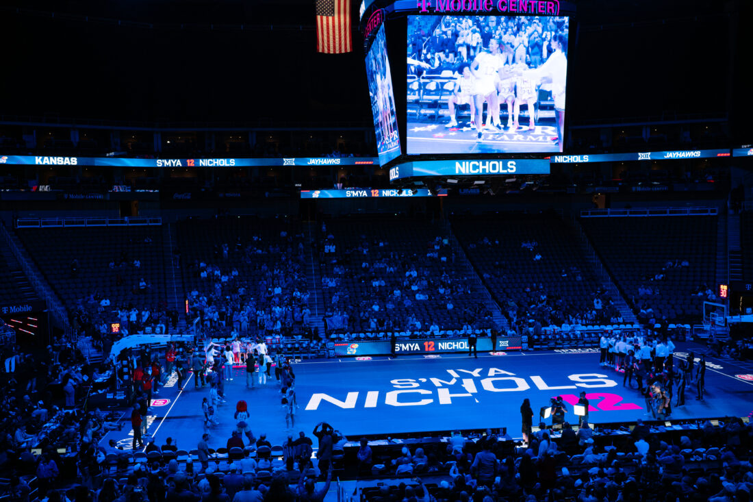 Kansas guard S’Mya Nichols is introduced before the game against UCF during the Big 12 Championships at the T-Mobile Center on Wednesday, March 4, 2026 in Kansas City, Mo.