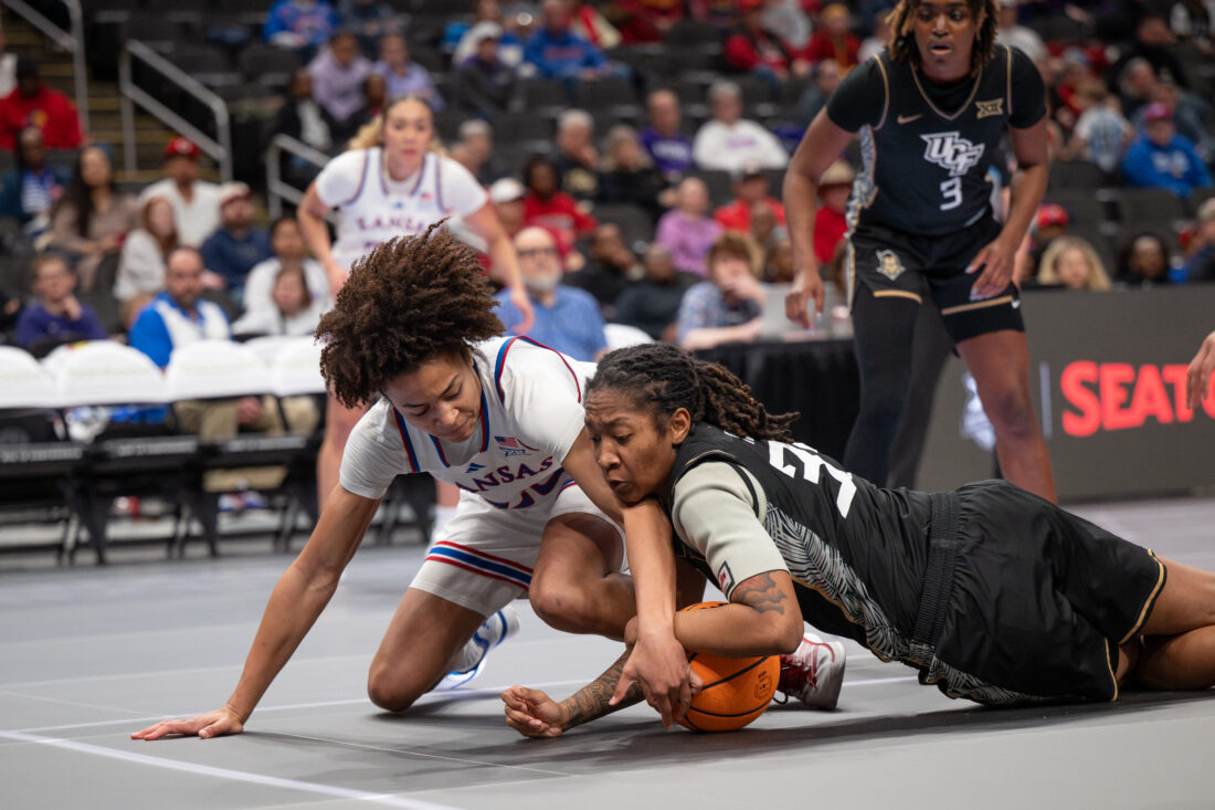 Kansas forward Jaliya Davis dives to the ground for a loose ball against UCF during the Big 12 Championships at the T-Mobile Center on Wednesday, March 4, 2026 in Kansas City, Mo.