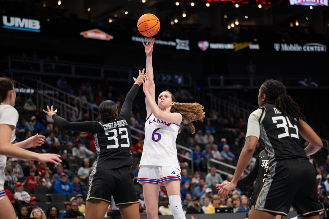 Kansas guard Elle Evans attempts a 3-pointer against UCF during the Big 12 Championships at the T-Mobile Center on Wednesday, March 4, 2026 in Kansas City, Mo.