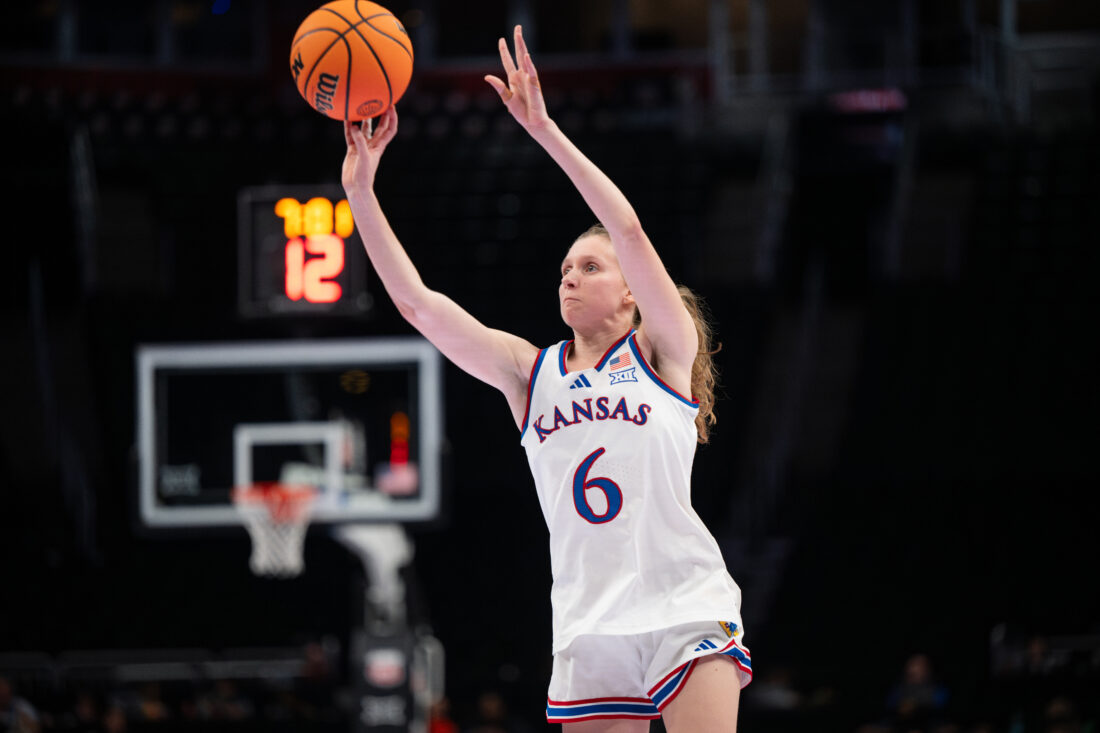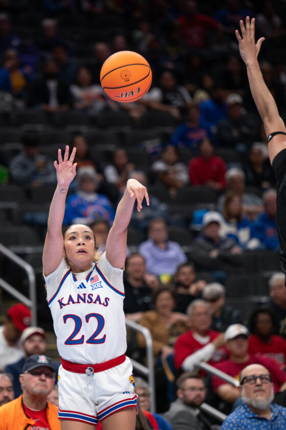 Kansas guard Brittany Harshaw hits a 3-pointer against UCF during the Big 12 Championships at the T-Mobile Center on Wednesday, March 4, 2026 in Kansas City, Mo.