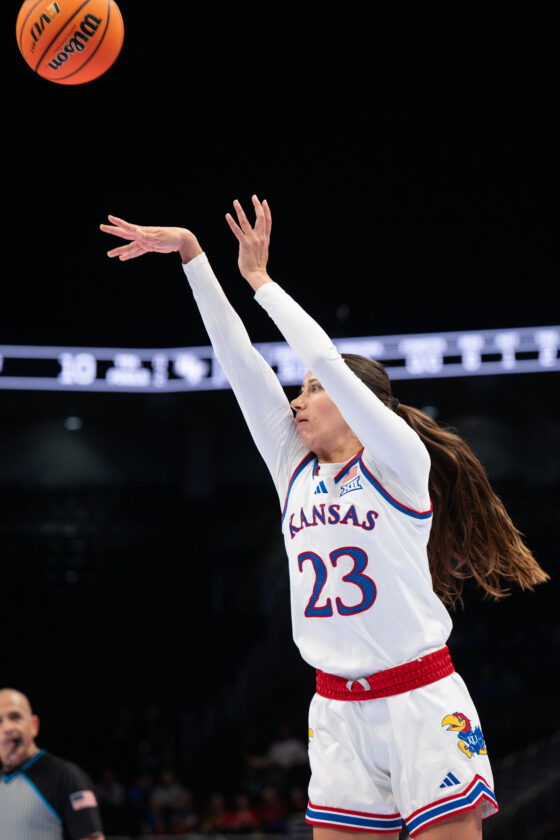 Kansas guard Laia Conesa hits a 3-pointer against UCF during the Big 12 Championships at the T-Mobile Center on Wednesday, March 4, 2026 in Kansas City, Mo.