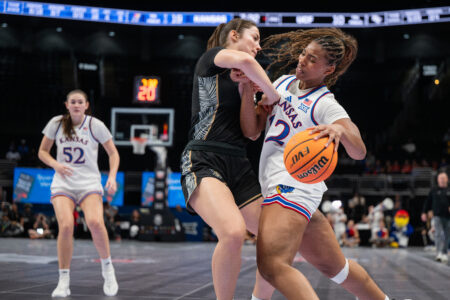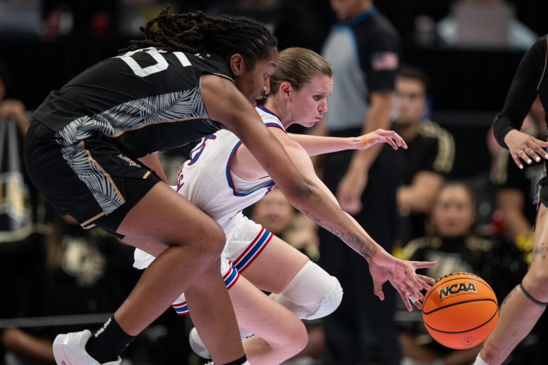 Kansas guard Laia Conesa is tripped up while making a pass to a teammate against UCF during the Big 12 Championships at the T-Mobile Center on Wednesday, March 4, 2026 in Kansas City, Mo.