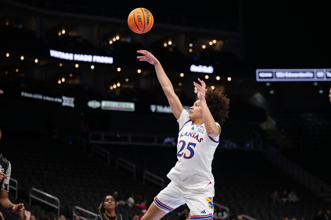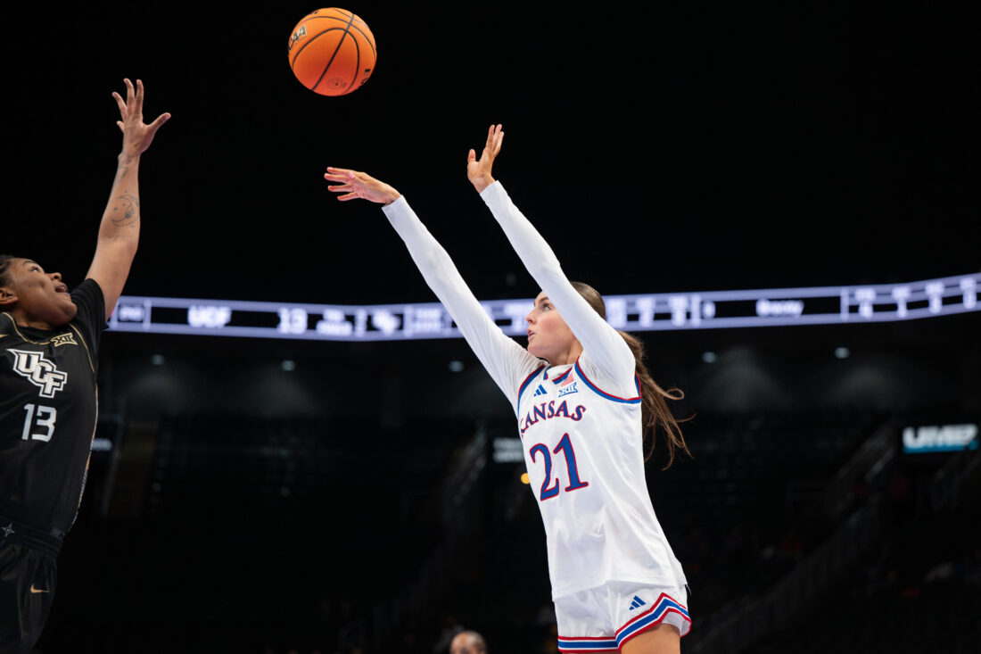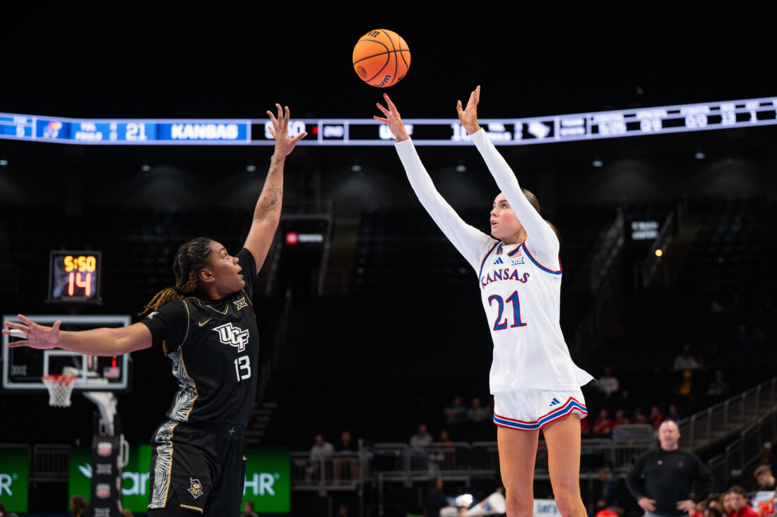 Kansas guard Sania Copeland hits a 3-pointer against UCF during the Big 12 Championships at the T-Mobile Center on Wednesday, March 4, 2026 in Kansas City, Mo.
