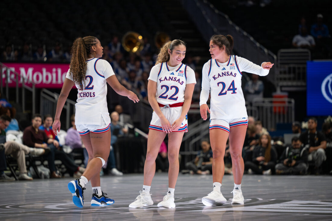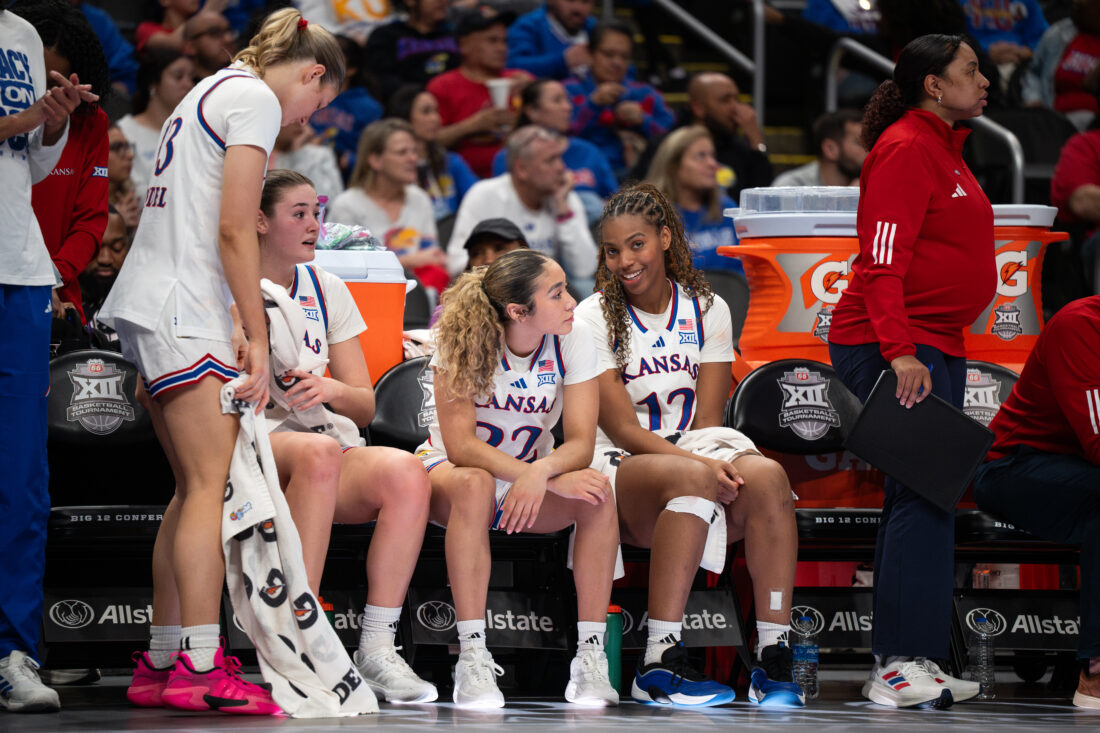 Kansas guard Sania Copeland shares a smile with forward Regan Williams during a break in play against UCF during the Big 12 Championships at the T-Mobile Center on Wednesday, March 4, 2026 in Kansas City, Mo.