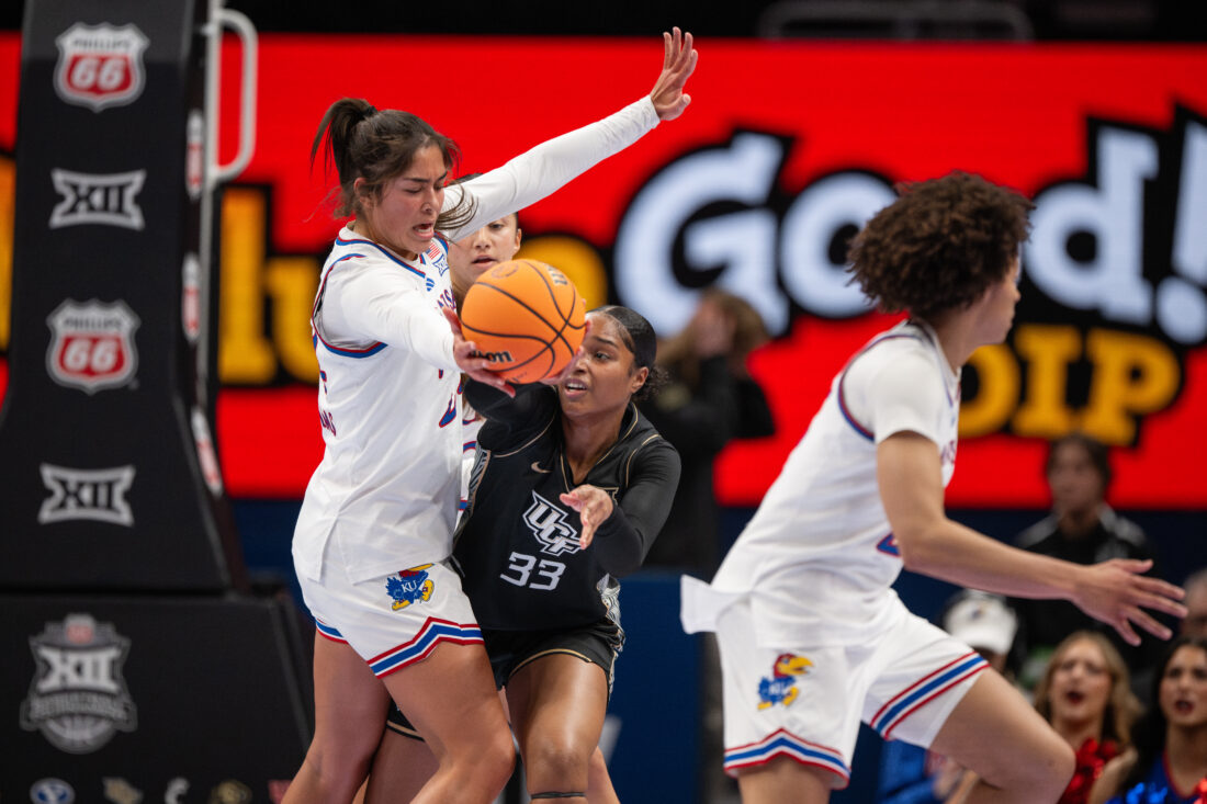 Kansas forward Regan Williams blocks a pass against UCF during the Big 12 Championships at the T-Mobile Center on Wednesday, March 4, 2026 in Kansas City, Mo.