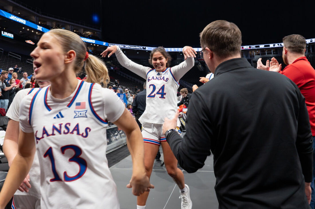 Kansas forward Regan Williams celebrates while running off the court after defeating UCF during the Big 12 Championships at the T-Mobile Center on Wednesday, March 4, 2026 in Kansas City, Mo.