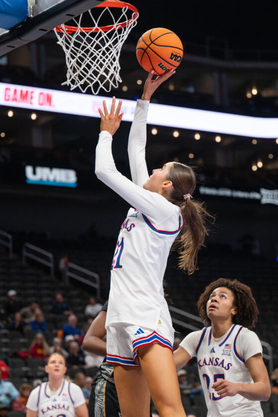 Kansas forward Regan Williams makes a layup against UCF during the Big 12 Championships at the T-Mobile Center on Wednesday, March 4, 2026 in Kansas City, Mo.