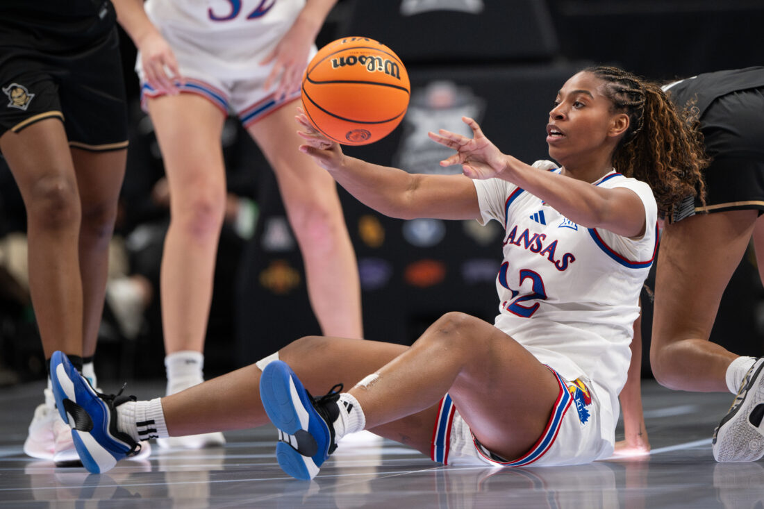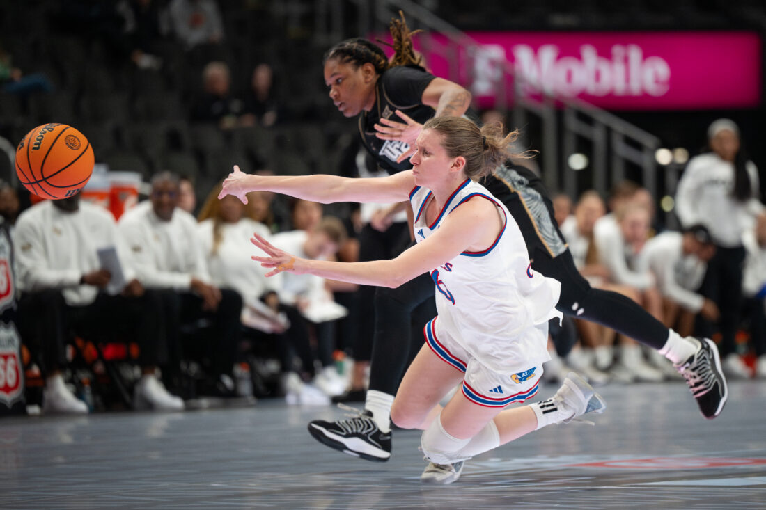 Kansas guard S’Mya Nichols makes a pass to a teammate from the ground against UCF during the Big 12 Championships at the T-Mobile Center on Wednesday, March 4, 2026 in Kansas City, Mo.