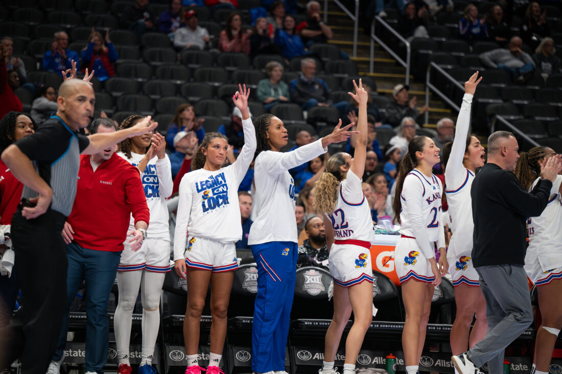 The Kansas bench celebrates a made 3-pointer against UCF during the Big 12 Championships at the T-Mobile Center on Wednesday, March 4, 2026 in Kansas City, Mo.