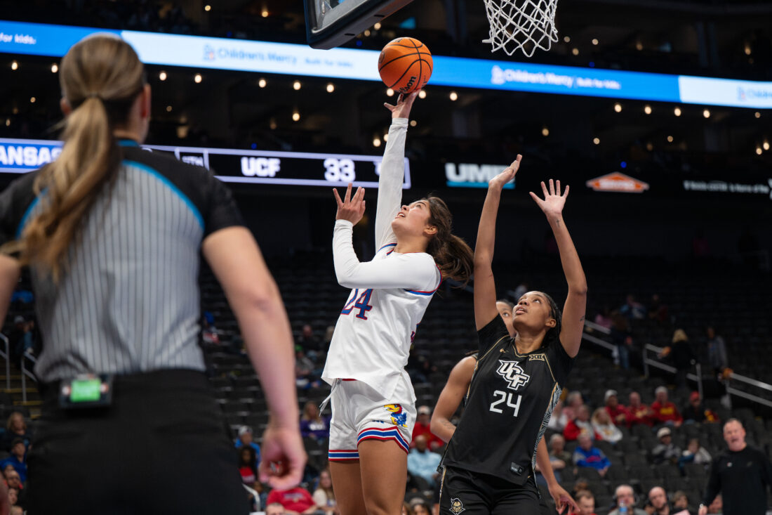 Kansas guard Elle Evans puts up a layup against UCF during the Big 12 Championships at the T-Mobile Center on Wednesday, March 4, 2026 in Kansas City, Mo.