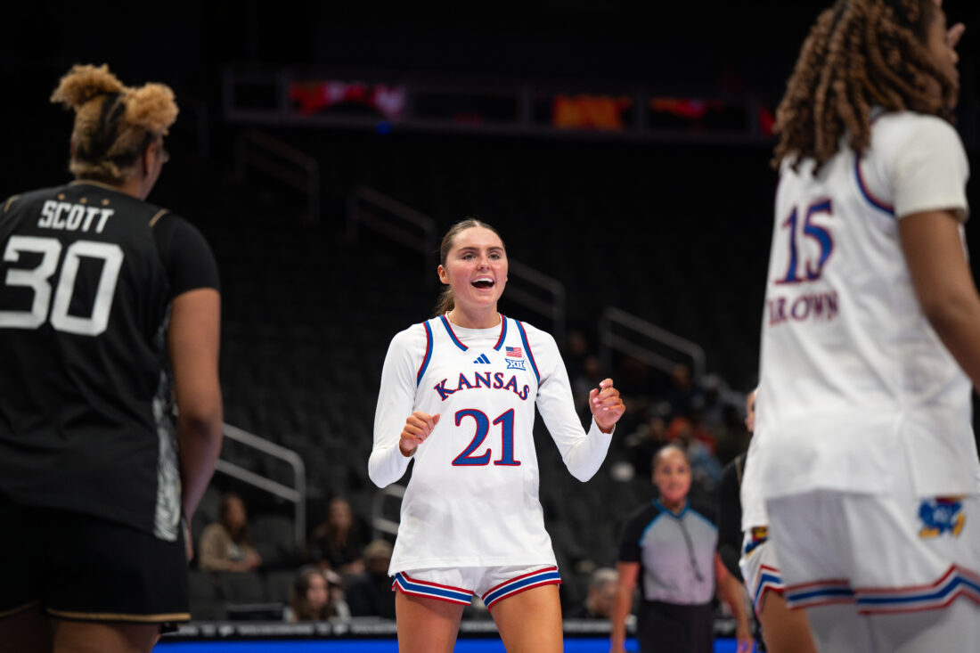 Kansas guard Elle Evans celebrates a play by a teammate against UCF during the Big 12 Championships at the T-Mobile Center on Wednesday, March 4, 2026 in Kansas City, Mo.