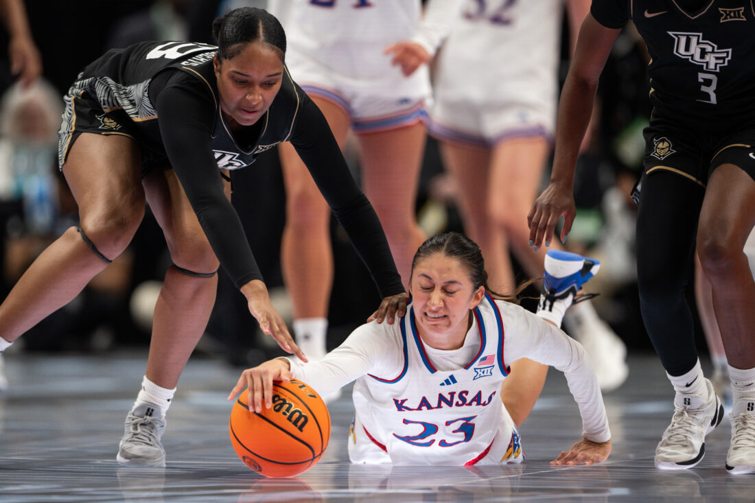 Kansas guard Laia Conesa goes to the ground to try and save the ball from going out of bounds against UCF during the Big 12 Championships at the T-Mobile Center on Wednesday, March 4, 2026 in Kansas City, Mo.