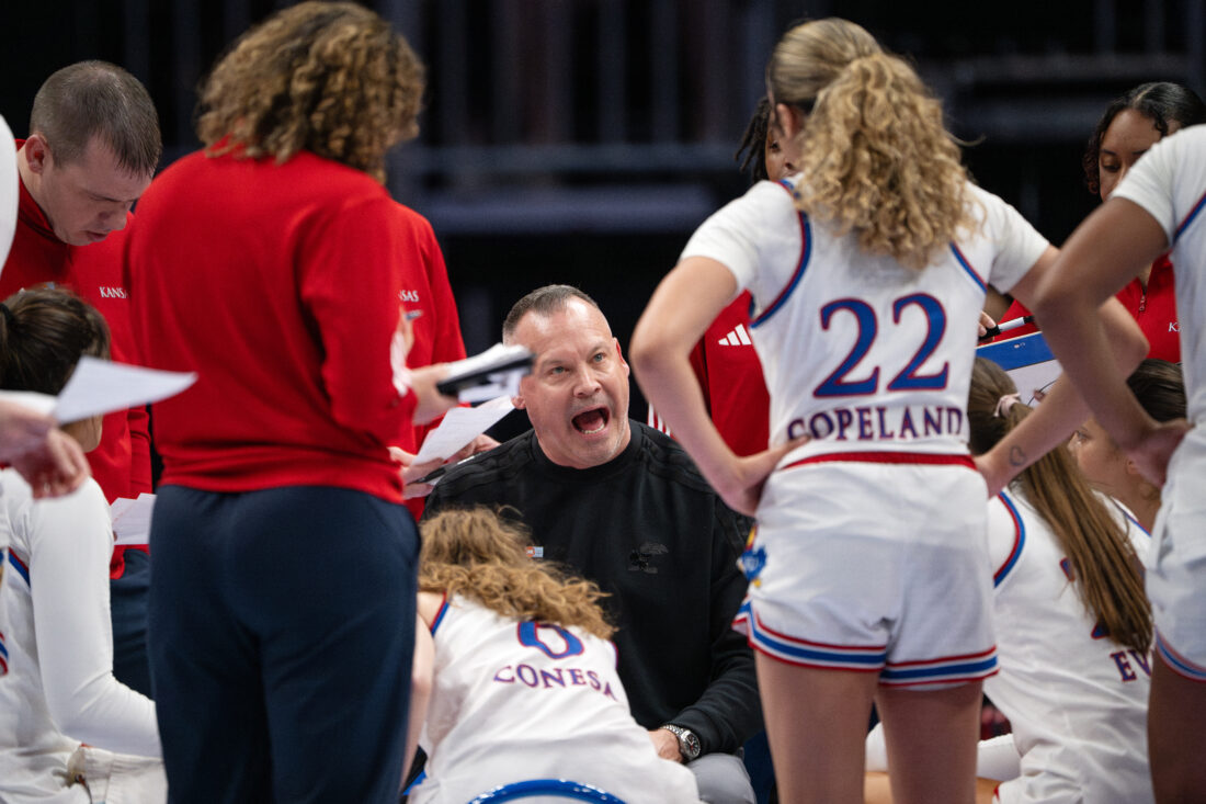 Kansas head coach Brandon Schneider talks with his team during a timeout against UCF during the Big 12 Championships at the T-Mobile Center on Wednesday, March 4, 2026 in Kansas City, Mo.