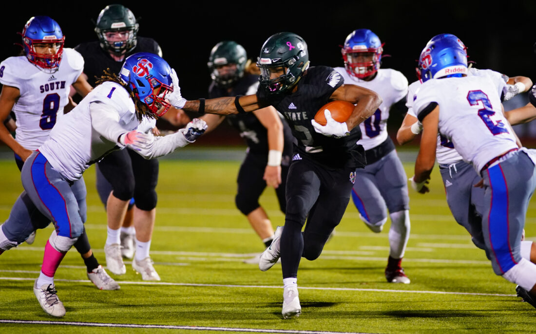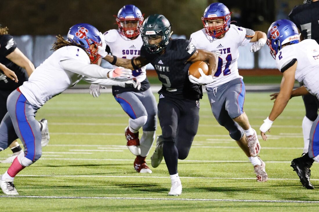 Free State running back Dash Cleveland explodes by a quartet of Wichita South defenders during the Firebirds’ opening-round playoff victory on Friday, Oct. 29, 2021 at FSHS.