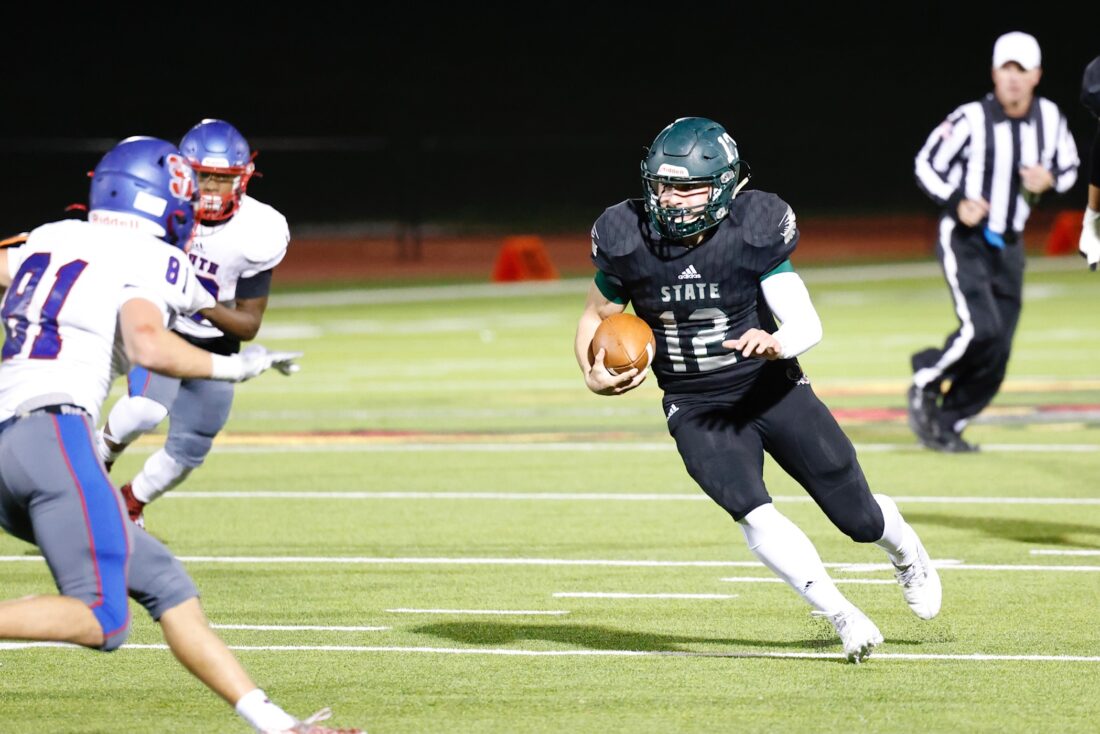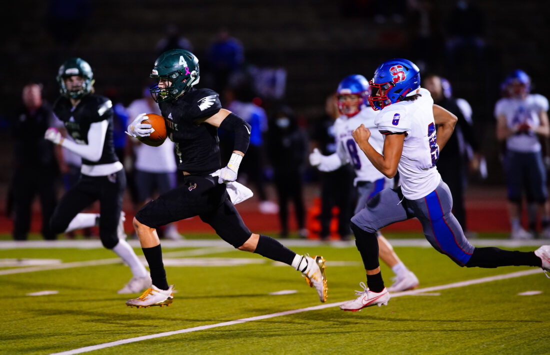 Free State quarterback Jet Dineen squares his shoulders to take on a Wichita South defender during the Firebirds’ opening-round playoff victory on Friday, Oct. 29, 2021 at FSHS.