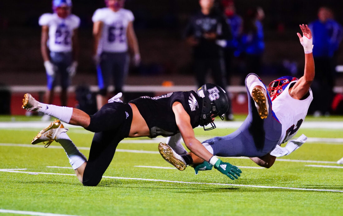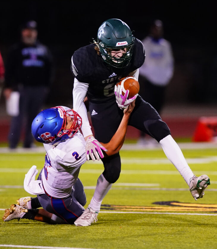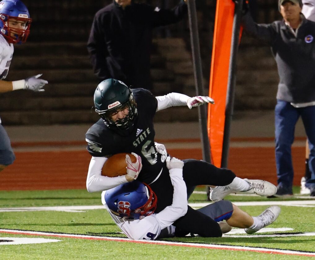 Free State receiver Jordan Brown is taken to the ground by a Wichita South defender after a big play during the Firebirds’ opening-round playoff victory on Friday, Oct. 29, 2021 at FSHS.