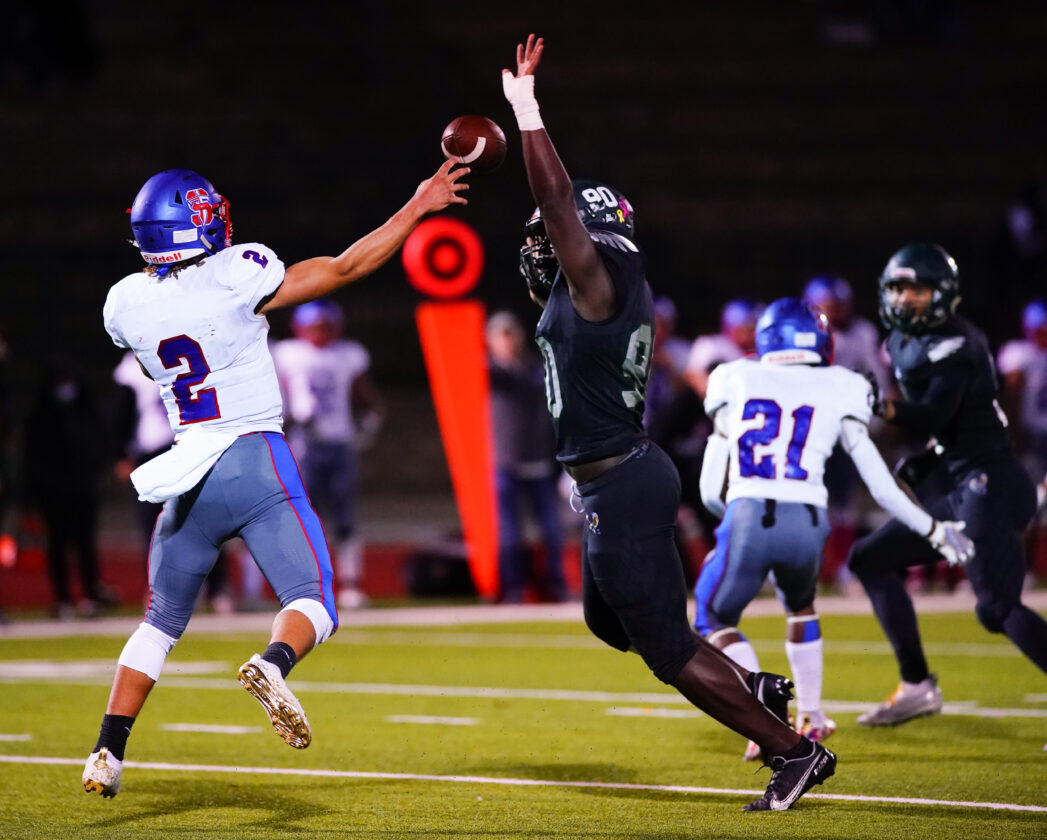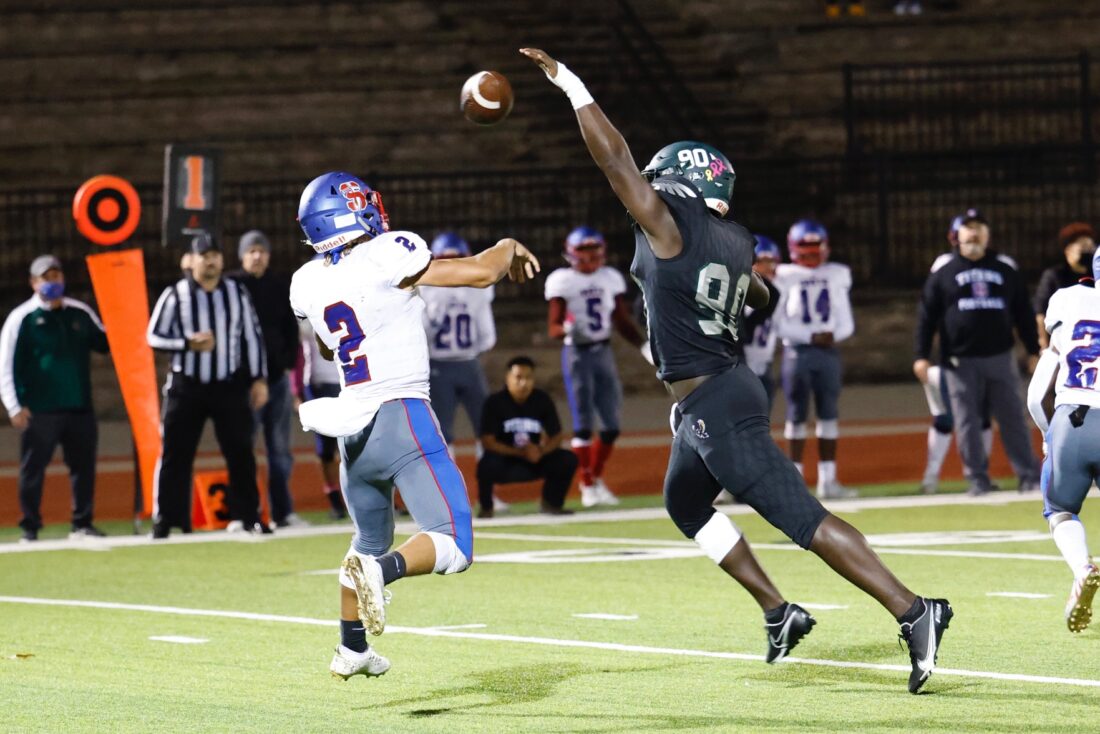 Free State defensive end Brian Lane bats down a pass from Wichita South quarterback TJ Neal during the first quarter, Friday, Oct. 29, 2021 at Free State High School.