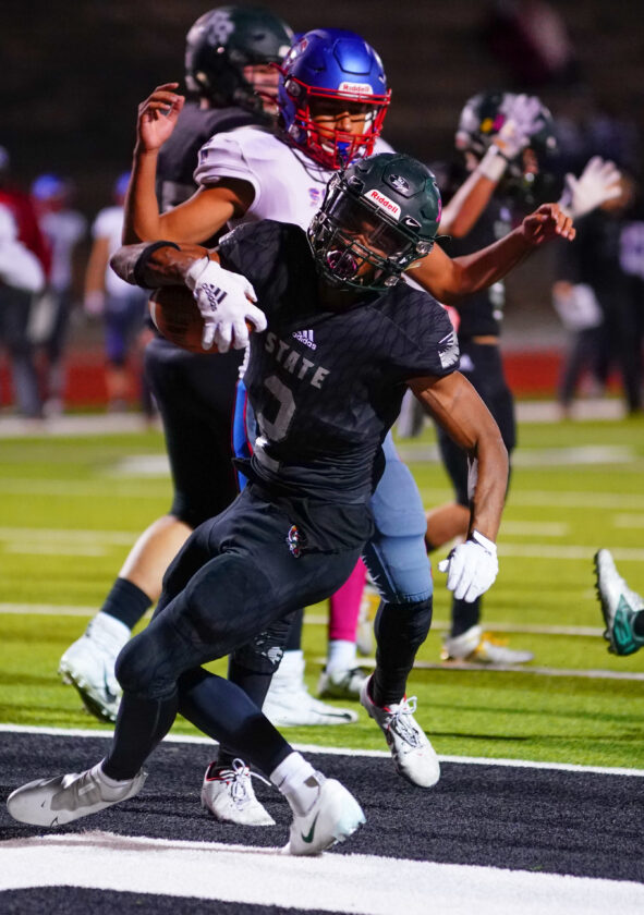 Free State running back Dash Cleveland spins into the end zone for a touchdown during the first quarter against Wichita South, Friday, Oct. 29, 2021 at Free State High School.