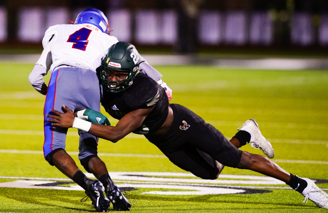Free State defensive back Mozae Downing tackles Wichita South receiver Aubrey Clark during the first quarter, Friday, Oct. 29, 2021 at Free State High School.