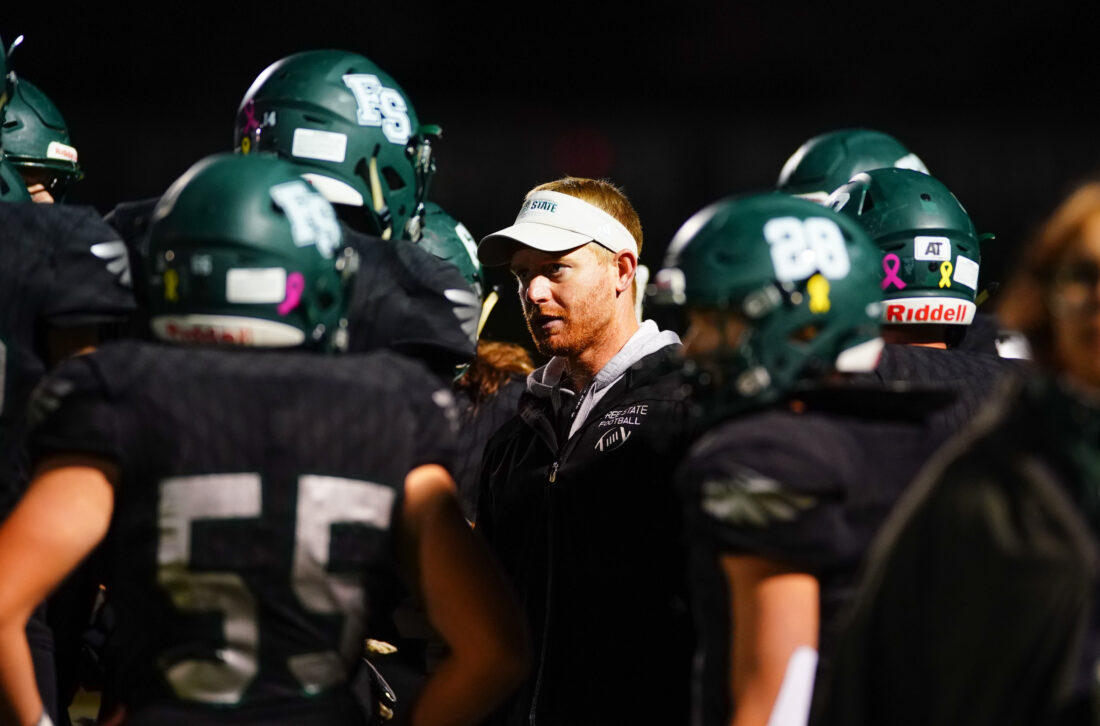 Free State head coach Kevin Stewart talks with his players late in the first quarter, Friday, Oct. 29, 2021 at Free State High School.