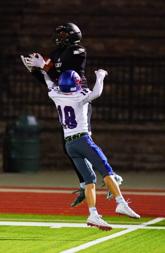 Free State receiver Jerred Willits catches a deep pass over Wichita South defensive back Ivan Teal during the second quarter, Friday, Oct. 29, 2021 at Free State High School.