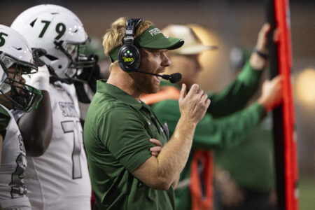 Free State head coach Kevin Stewart yells out during the game against Shawnee Mission South at Shawnee Mission District Stadium, South Location, on Thursday, Oct. 9, 2025 in Overland Park.