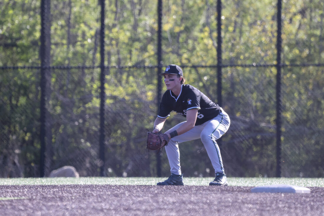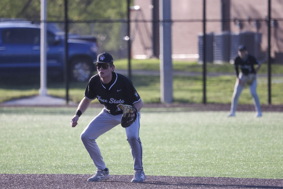 Free State shortstop Ben Graves creeps into position during the Firebirds’ game against Mill Valley on Thursday, April 16, 2026, at Mill Valley High School in Shawnee.