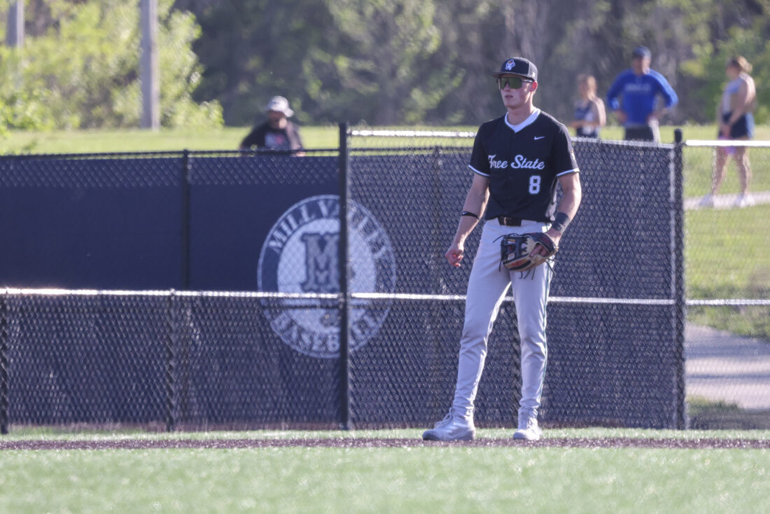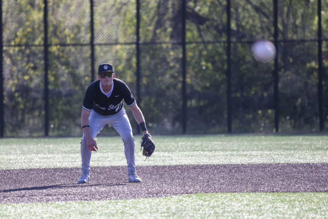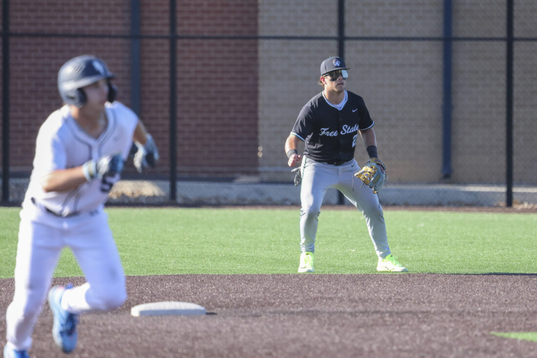 Free State second baseman Finn Moore reacts to a hit during the Firebirds’ game against Mill Valley on Thursday, April 16, 2026, at Mill Valley High School in Shawnee.