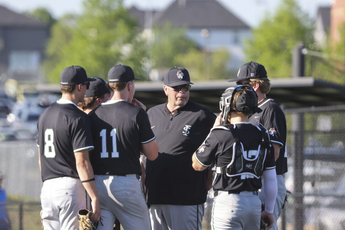 The Free State infield huddles on the mound during the Firebirds’ game against Mill Valley on Thursday, April 16, 2026, at Mill Valley High School in Shawnee.