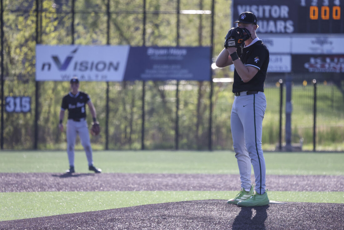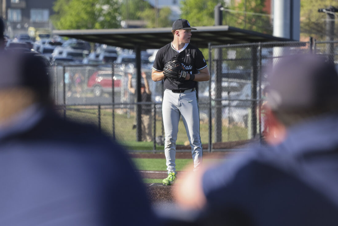Free State pitcher Zane Shaw looks to his catcher during the Firebirds’ game against Mill Valley on Thursday, April 16, 2026, at Mill Valley High School in Shawnee.
