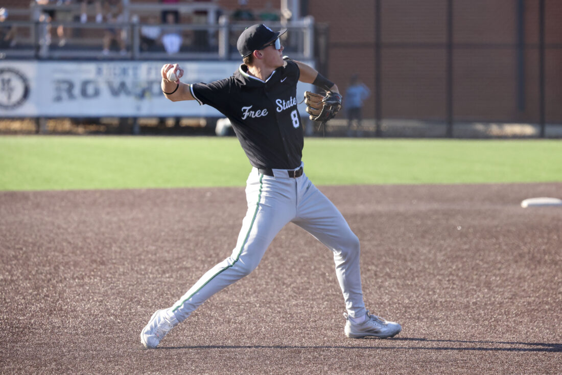 Free State third baseman Owen Lester throws over to first during the Firebirds’ game against Mill Valley on Thursday, April 16, 2026, at Mill Valley High School in Shawnee.