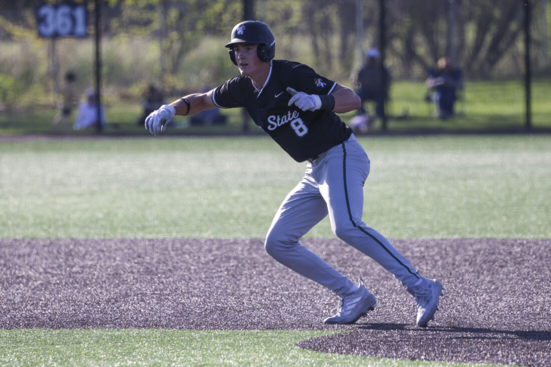 Free State junior Owen Lester takes off from first base during a hit and run play during the Firebirds’ game against Mill Valley on Thursday, April 16, 2026, at Mill Valley High School in Shawnee.
