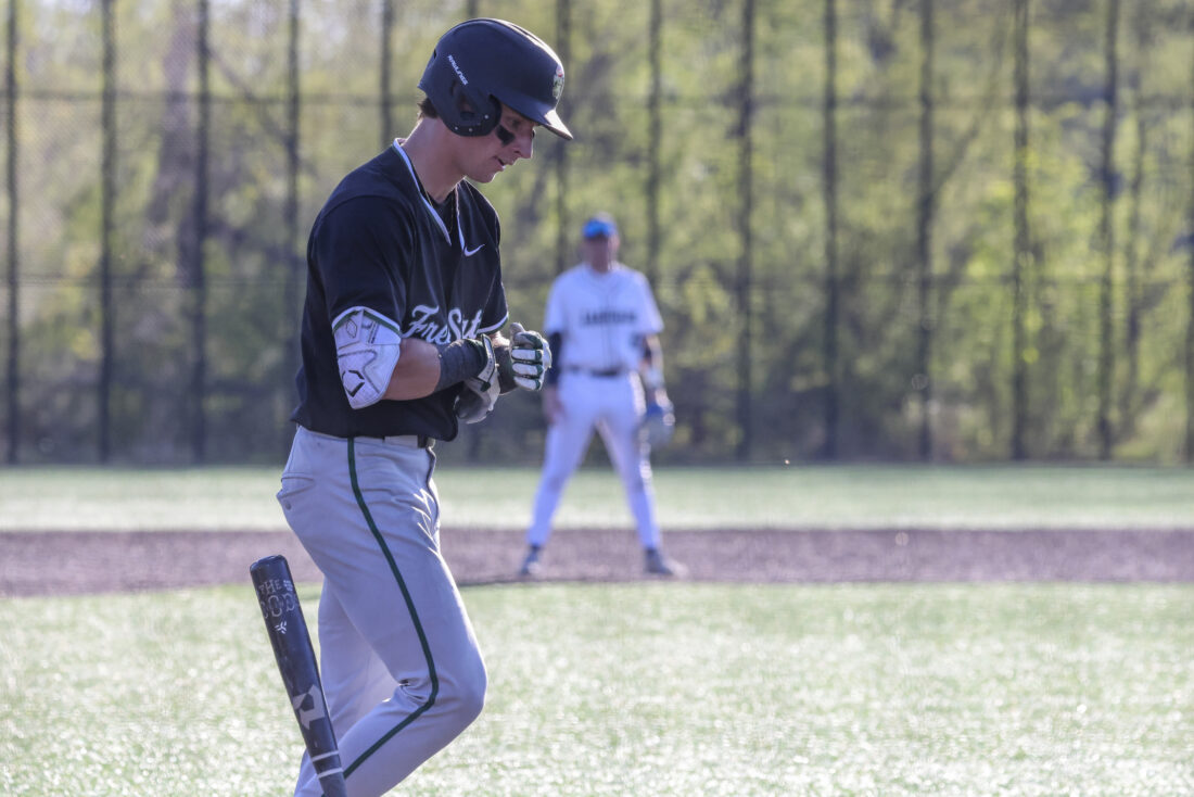 Free State junior Ryker Mahnke heads to first base after being walked in the Firebirds’ game against Mill Valley on Thursday, April 16, 2026, at Mill Valley High School in Shawnee.
