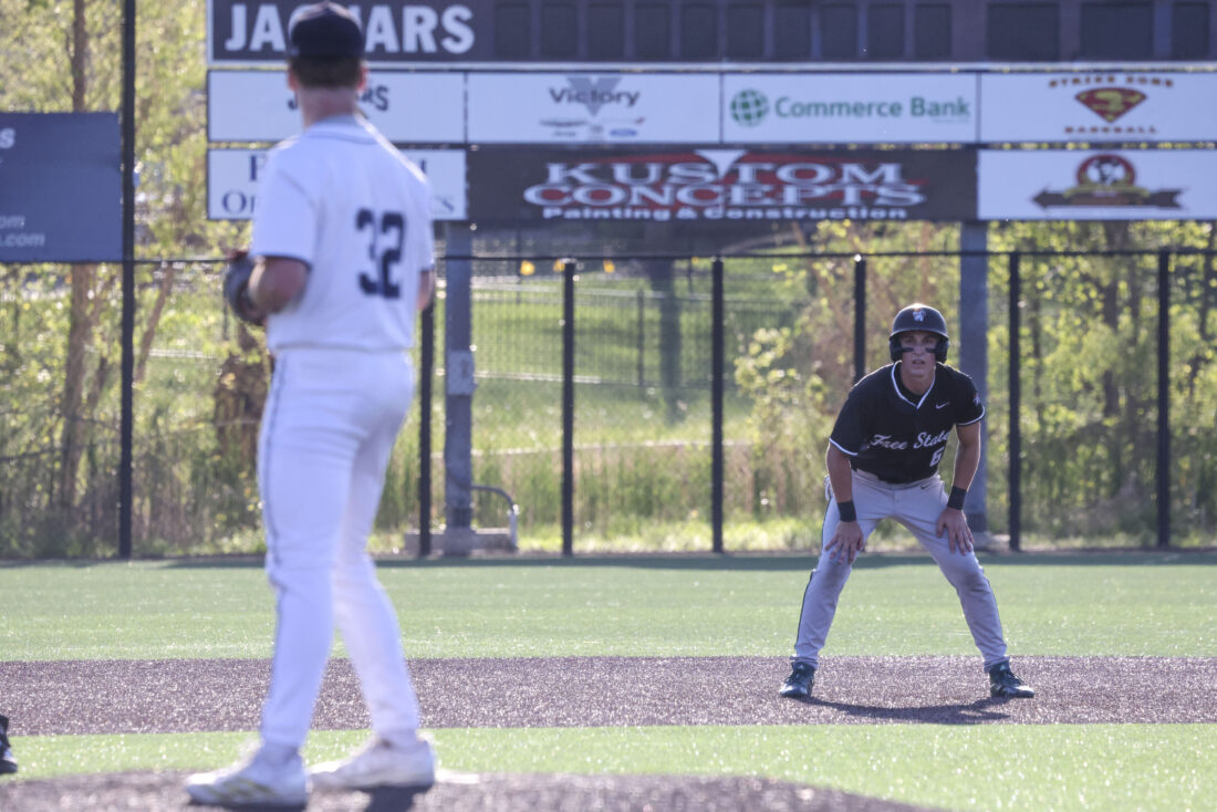 Free State senior Ben Graves takes a lead off second base during the Firebirds’ game against Mill Valley on Thursday, April 16, 2026, at Mill Valley High School in Shawnee.