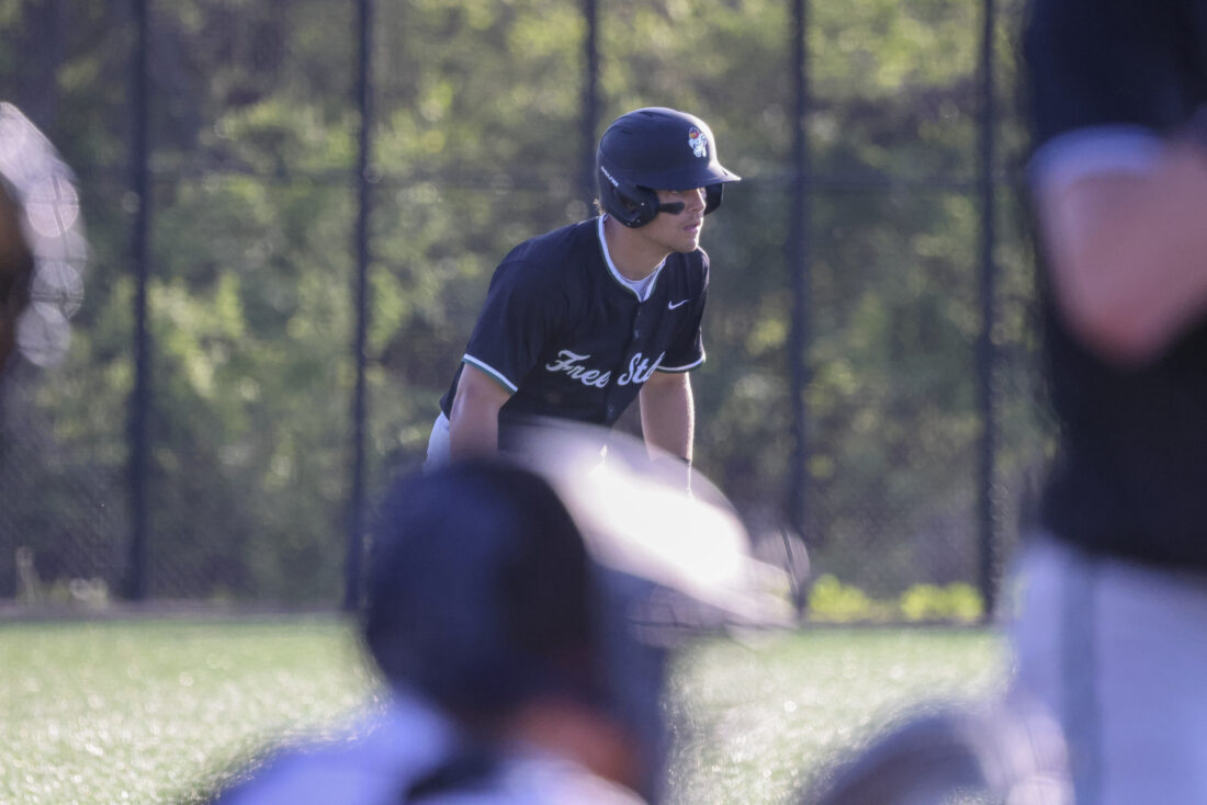 Free State senior Ryan Vigna watches as a pitch is delivered to the plate as leads off from third during the Firebirds’ game against Mill Valley on Thursday, April 16, 2026, at Mill Valley High School in Shawnee.