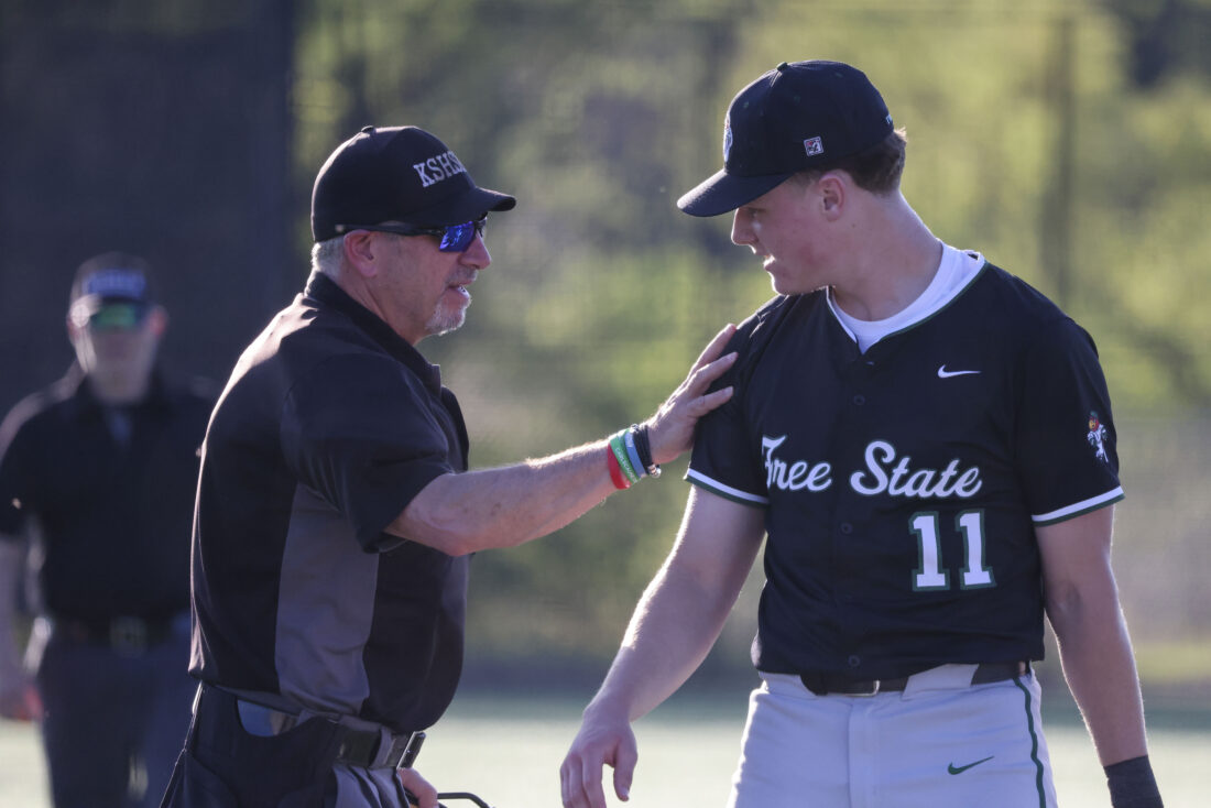 Free State pitcher Zane Shaw shares a chat with an umpire after closing out an inning during the Firebirds’ game against Mill Valley on Thursday, April 16, 2026, at Mill Valley High School in Shawnee.