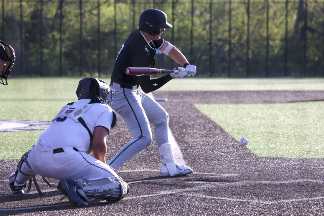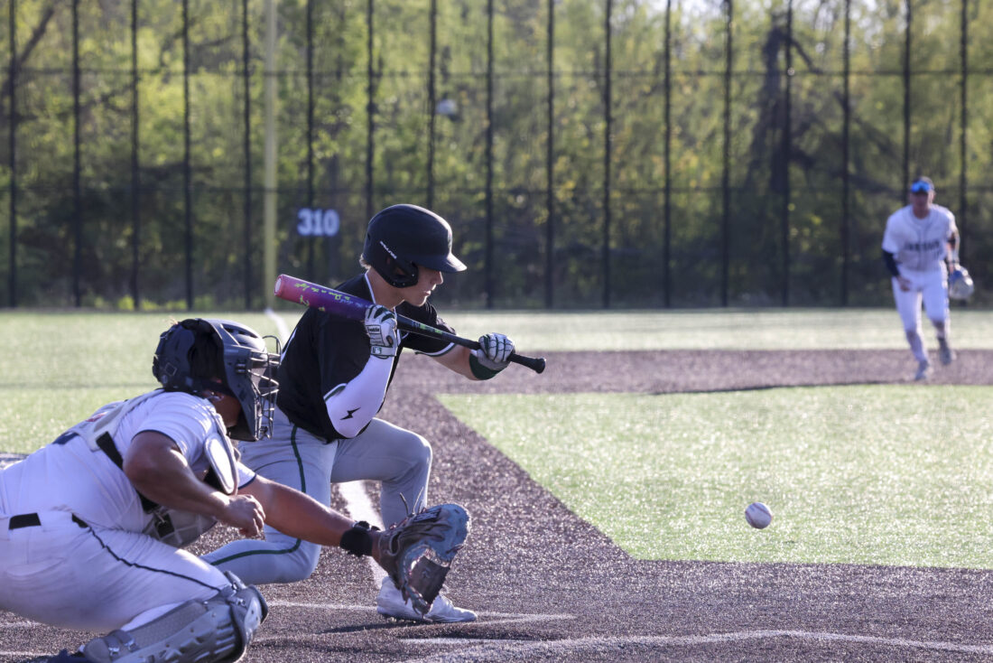 Free State sophomore Carter Laubach pulls back from bunting during the Firebirds’ game against Mill Valley on Thursday, April 16, 2026, at Mill Valley High School in Shawnee.