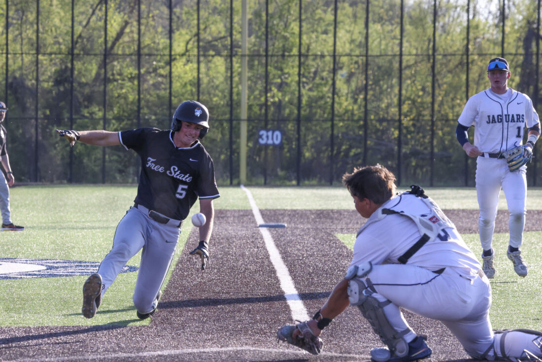 Free State senior Ben Graves scores a run during the Firebirds' game against Mill Valley on Thursday, April 16, 2026, at Mill Valley High School in Shawnee.