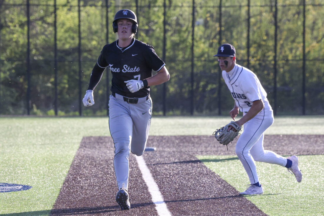 Free State senior Nathan Young trots home to score a run during the Firebirds’ game against Mill Valley on Thursday, April 16, 2026, at Mill Valley High School in Shawnee.
