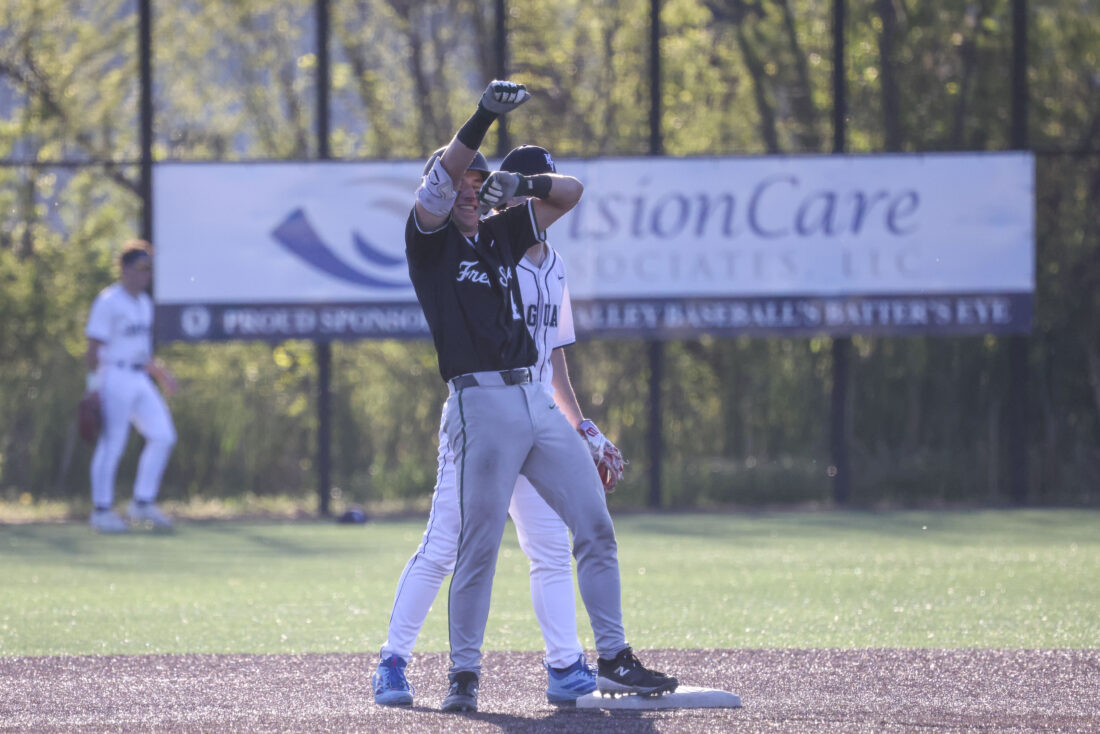 Free State junior Ryker Mahnke celebrates after hitting a double during the Firebirds’ game against Mill Valley on Thursday, April 16, 2026, at Mill Valley High School in Shawnee.