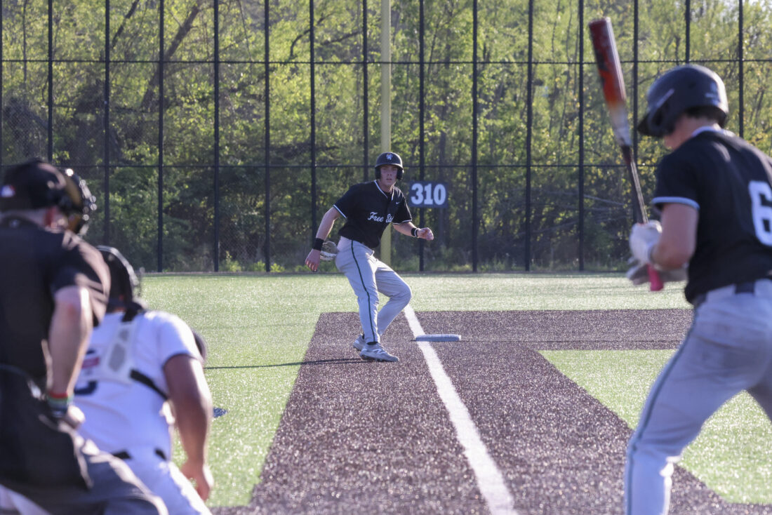 Free State junior Finn Moore takes his lead off third base during the Firebirds’ game against Mill Valley on Thursday, April 16, 2026, at Mill Valley High School in Shawnee.