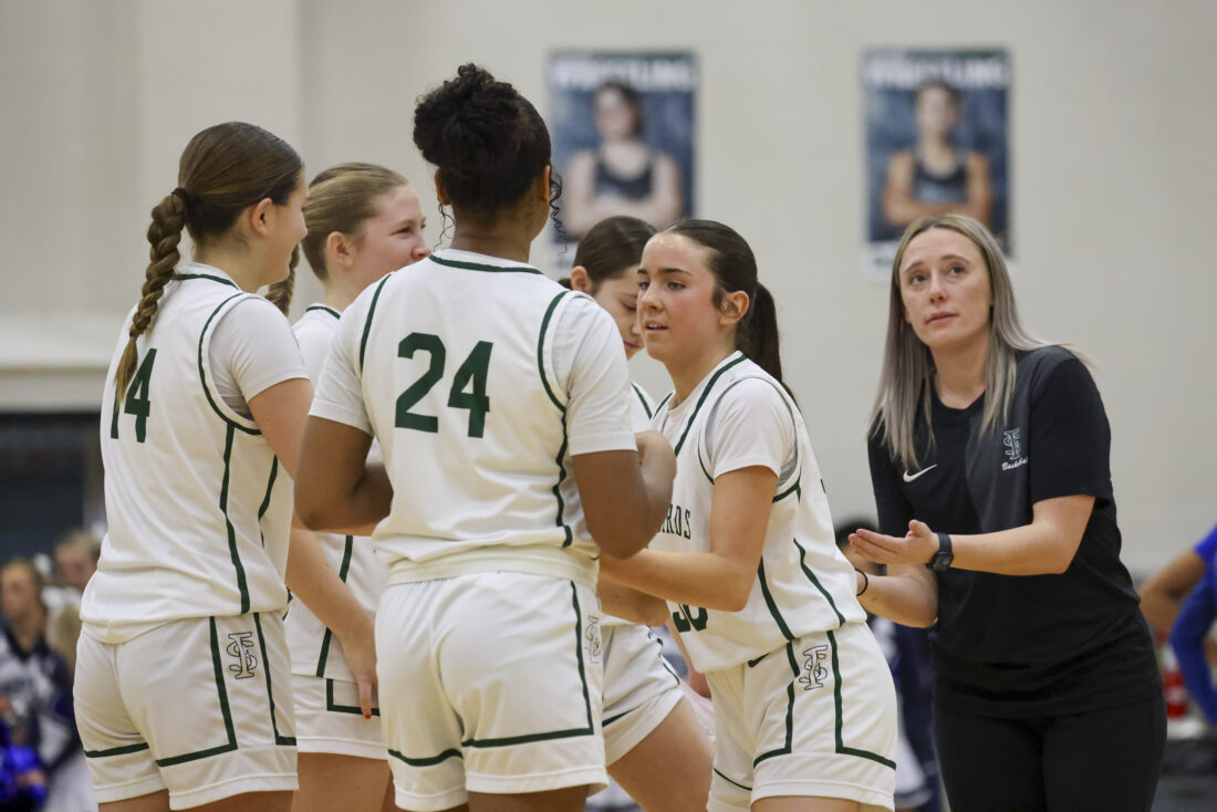 The Free State girls basketball team huddles prior to the Firebirds’ game against Olathe West on Friday, Feb. 6, 2026, at Free State High School in Lawrence.