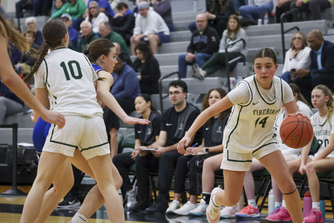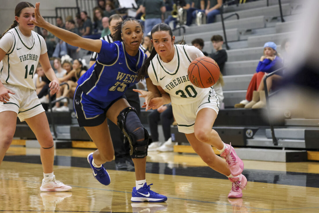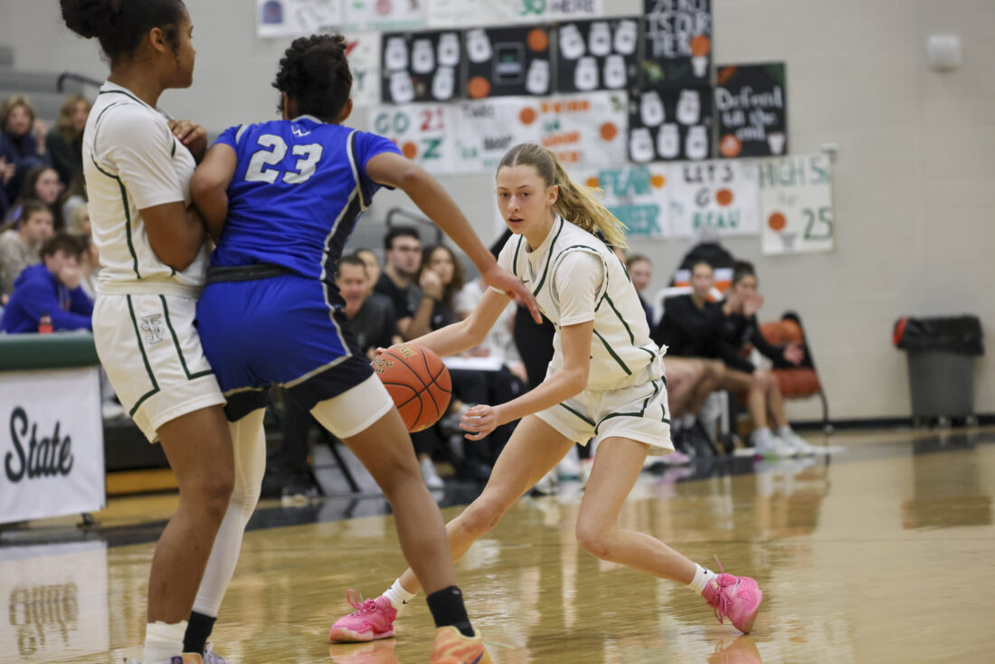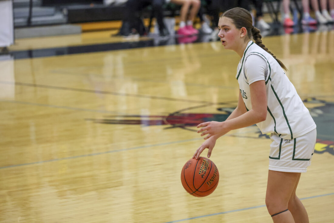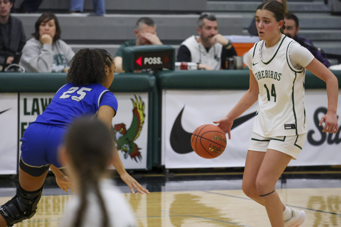 Free State freshman Quinlynn Vail looks for options as she brings the ball down the court during the Firebirds’ game against Olathe West on Friday, Feb. 6, 2026, at Free State High School in Lawrence.
