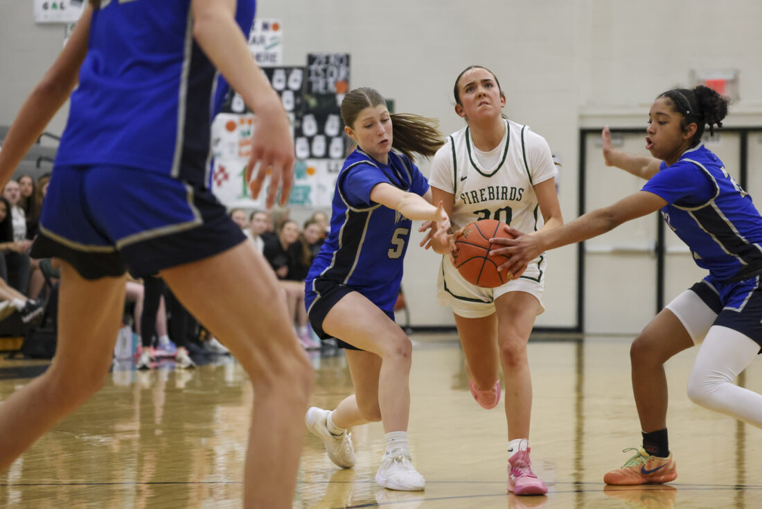 Free State junior Sarai Preston looks for space during the Firebirds’ game against Olathe West on Friday, Feb. 6, 2026, at Free State High School in Lawrence.